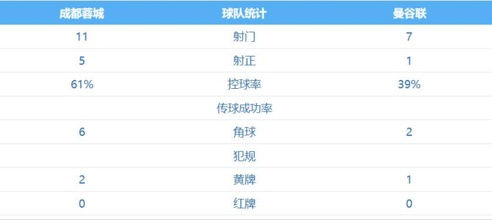 全场比赛,成都蓉城的控球率为61%,一共有11次射门,其中5次射正;曼谷联一共有7次射门,其中仅有1次射正。