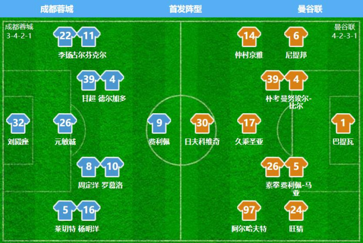 成都蓉城vs曼谷联,徐正茂排出3421阵型,费利佩突前,身后是罗慕洛和德尔加多,杨明洋、周定洋、甘超、古尔芬克尔组成四中场,莱切特、元敏诚、李扬组成三后卫,刘殿座守门,首发总身价675万欧元,首发平均年龄30.3岁;曼谷联方面4231阵型,首发总身价327.5万欧元,首发平均年龄29.5岁。
